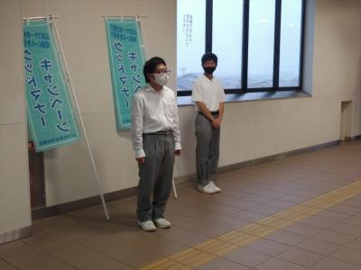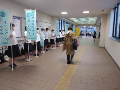 あいにく、激しい雨のため、電車が運休となり、地域の方や登校する生徒はまばらでしたが、元気な声がして、さわやかな雰囲気を作っていました。