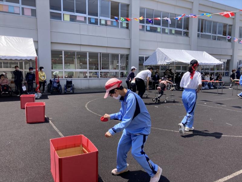 「紅白玉入れ」かごをめがけて、投げろ!投げろ!