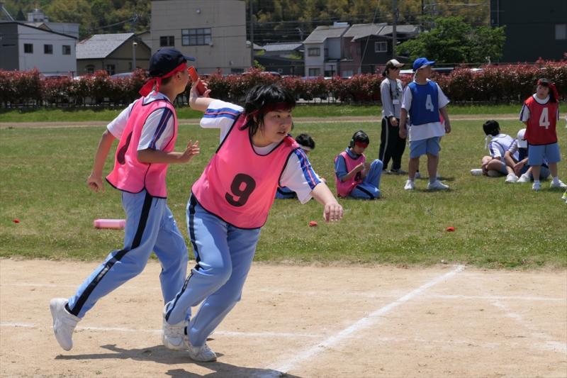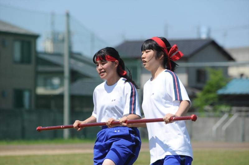 「棒運び」お互いの呼吸を合わせて、次の組へと棒をつなぎます。