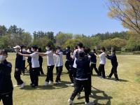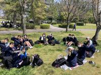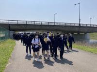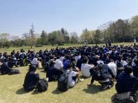 4/20(水)に遠足が実施されました。西部緑地公園まではほぼ犀川沿いの道。天候にも恵まれ、風を感じながら歩く道のりはとても気持ちがよく、参加生徒全員が最後まで無事歩きとおせました。公園では、午前中はクラス単位によるホーム行事。続く昼食では大きな円を作りながらの食事の光景が多く見られました。午後には生徒の司会進行によるクラス対抗「台風の目」。学年が一体となり盛り上がっていました。とても有意義な遠足であったと思います。