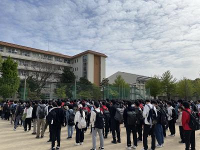 昨日の連絡通り、本日25日(水)は授業の開始を遅らせ、午前9時登校とし、45分授業を行います。