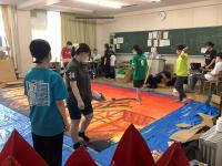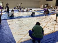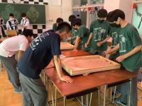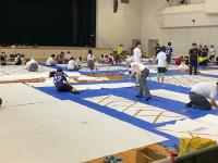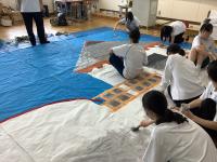 3年生の後期補習が終わり、本格的に創立記念祭(文化祭)の準備が始まりました。講堂では、3年生が野外劇に使う大型の背景画を作成しています。今日は模造紙をガムテープで張り合わせる作業が行われていました。センターに飾られる背景画の大きさは模造紙たて5枚、横9枚分です。野外劇当日は、1年生がこの背景画を降ろしてくれます。