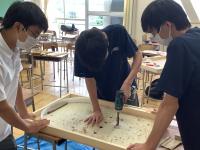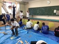 土曜日の今日。校内やグラウンドで、多くの生徒が来週から始まる記念祭に向けて準備をしていました。ベニヤ板にペンキを塗ったり、ドリルで穴をあけたりしているのは1年生。教室や屋外では3年生が先日張り合わせた模造紙に背景画を描いていました。背景画と並行して、Chromebookを使って野外劇の音声編集を行っているグループ。ミシンなどを使って衣装や小道具を製作するグループ。試行錯誤しながらのクリエイティブな活動は楽しそうです。