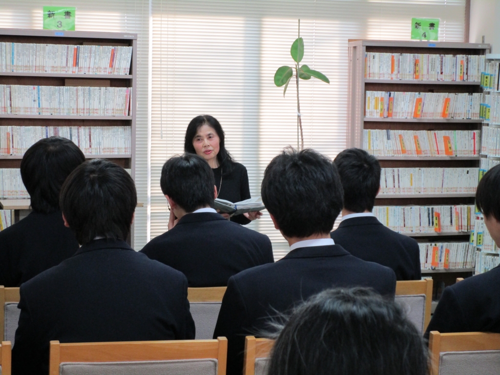 終業式の日の午後、図書館で年内最後の行事「おはなし会」を実施しました。話し手は、一昨年もお願いした細川律子さんです。細川さんは宮沢賢治の故郷である岩手県のご出身で、現在は、石川県内の自宅で家庭文庫を開き、子どもたちと一緒に物語を楽しんでいらっしゃいます。