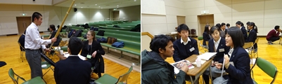 12月9日、1年生全員が参加するディスカッションデーを行いました。県内のALT19名、金沢大学留学生18名の合計37名を迎えて交流しました。生徒は3人~5人で1つのグループとなり、外国人と英語で会話をしました。日本文化を紹介する場面では、様々な写真や実物、実演を交えて積極的に交流する姿が見られました。日ごろの英語の学習で身につけた実践的な会話力を発揮する機会となりました。