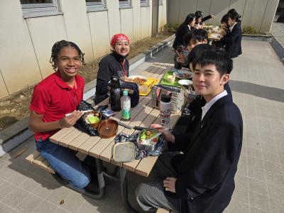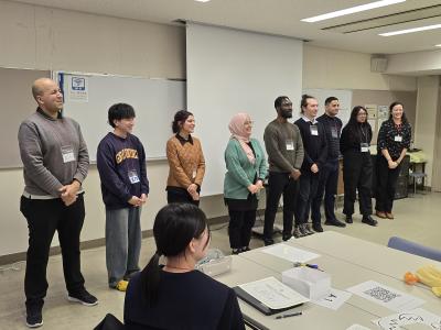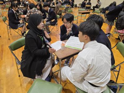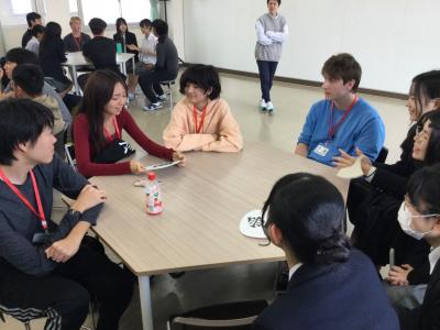 【生徒の感想】授業でなかなか自分の意見や思いを英語で伝えることができず、英語でのコミュニケーションに苦手を持ち始めていた。しかし、留学生の方々が、文法が多少違っても、私が言いたいことを汲み取って、笑顔で会話をしてくださって、改めて英語で話すことの楽しさを感じることができた。今回のイベントでは、留学生の方々の発言をすべて聞き取れたというわけではなかったので、これからの英語の学習で、単語力などの向上を目指したいと思った。