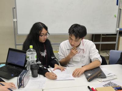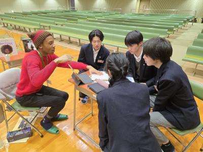各グループの外国人留学生のみなさんは、日本の大学で学ばれている方々で、明るい雰囲気で高校生たちを鼓舞してくれました。留学生の方々の出身は、アンゴラ、ポルトガル、ベトナム、ブラジル、バングラデシュなどの非英語圏の国々で、生徒たちにとっては様々な英語を聞く機会にもなりました。この設定の最も素晴らしかった部分は、参加者の間に「英語を外国語で学ぶ仲間たち」という共通意識が芽生えたことでした。その中で、本校生徒たちも、他者の目を通して世の中を眺めることの醍醐味、自分の世界観を変えてくれるかもしれない生き方に接する驚きを感じてくれたと思っています。