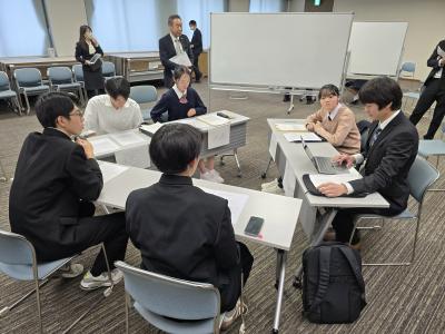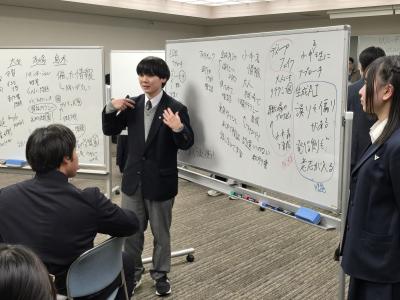 また、2年生を対象に開催された「社会人と語る会」では、異なる業界で活躍する社会人OB・OG12名が集まり、「働くとは?」というテーマでプレゼンテーションを行いました。その後、参加者はグループディスカッションに分かれ、各職業に関連する「問い(仮説)」について意見を交わしました。社会人の講師たちが提示した難解な問いに対して、2年生はグローバル化が進む社会で求められるスキルや価値観を考えながら、10年後、20年後の自分たちの姿を思い描きつつ真剣に議論を行いました。