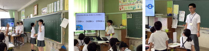令和4年度から継続して、「子どもたちに海ゴミ問題を始めとする環境問題に興味をもらおう!」をテーマに、普通科2、3年生が継続的に活動を行なっている。「普段は教わる側の高校生が先生として教壇に立つ」だけでなく、授業案から全て高校生が練って臨んでいる。今年も7月12日に総勢19名の生徒が泉野小学校5年生3クラスでの出前授業を行なった。