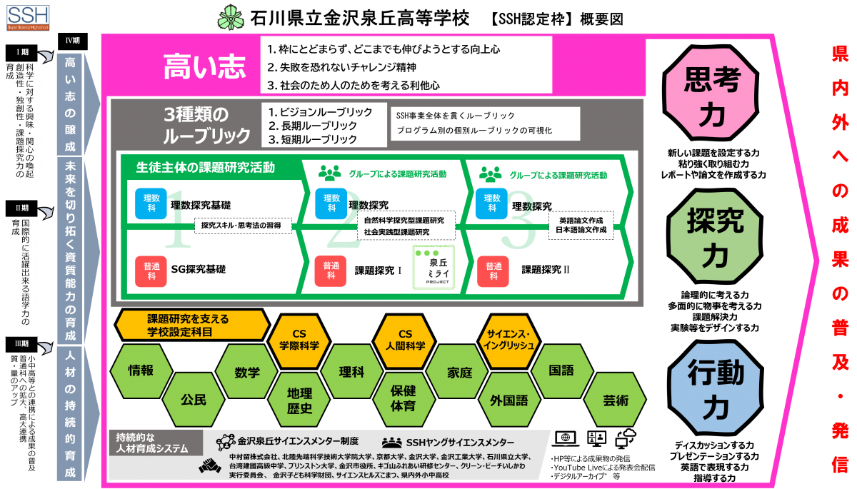 本校は、SSH 第Ⅰ~Ⅳ期の指定を通して「高い志の醸成」「未来を切り拓く資質・能力の育成」「人材の持続的な育成」を図り、学校設定教科・科目を土台にした3 年間の課題研究活動を軸として研究開発に取り組んできた。