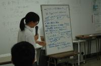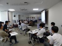 4名の班に分かれ、それぞれが行っている探究活動を紹介しあいました(質疑応答含め8分)。その後、班の代表者が班の意見を前で発表。それぞれが取り組んでいる活動を共有しました。「廃棄野菜からプラスチックの代替材料を作る」や「ゼラチンを用いた新素材の開発」、「小学生に海と陸のつながりを知ってもらう」など、様々な分野のテーマがあり、それぞれの目的や問題点などを共有しました。