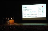 これまで「石川県SSH生徒研究発表会」は、県内のSSH指定校と金沢桜丘高校、金沢二水高校が参加する形で行われてきましたが、今年度は、金沢大学が主催するWPI(世界トップレベル研究拠点プログラム)のサイエンスシンポジウムとの合同企画で、午前中は第一線で活躍されている研究者の方々の講演を聞くことができました。午後からは代表2班がステージで10分間のプレゼン+5分間Q&Aの口頭発表を行い、その後全ての班が「数学+物理/化学/⽣物/⽣物+化学/地学+複合」の5グループに分かれ、各チーム90秒間のフラッシュトーク+8分間のQ&Aの形式で研究成果を発表しました。