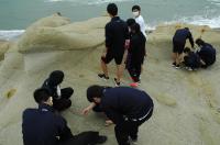 片野海岸・・・この場所に分布する火砕流堆積物の観察を行ました。軽石や火山豆石(ピソライト)を確認することができました。