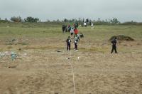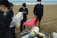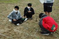 塩屋海岸・・・塩屋海岸では、汀線から内陸に向かって巻き尺を伸ばし、そのラインに沿って15m間隔で1m平方のコドラートを設置し、海浜植物調査を行いました。また、漂着した海洋プラスチックごみの調査・回収を行いました。