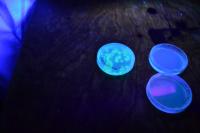 生物実験②・・・前日にインキュベーターで培養していた大腸菌のコロニーを確認し、数を数えました。また紫外線をあて、形質転換が上手くいったかを確認しました。