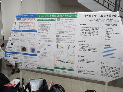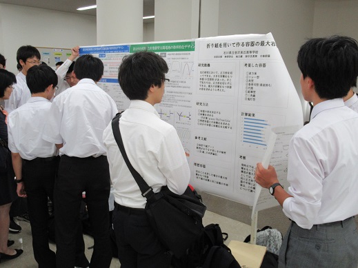 8月25日(土)に、関西学院大学西宮上ヶ原キャンパスで、上記の数学に関する研究発表会が開催されました。本校からは、佐々木君(29H)、田原君(20H)、松本君(20H)、御手洗君(20H)、中橋君(11H)、時岡君(16H)、油片君(10H)、片岡君(10H)、駒形君(10H)、松村さん(10H)が参加し、それぞれ「折り紙を折って作る器の最大容積」「黄金角を利用した針葉樹型太陽電池の効率的なデザイン」という演題でポスター発表を行いました。