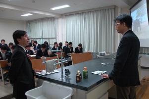 12月8日(金)に名古屋大学大学院の篠田渉先生をお招きし、上記の演題で特別講義を行っていただきました。分子一つ一つの物理的な動きをシミュレーションで画像化することで、薬剤の吸着性や安定性をみて創薬に応用するという最先端の手法を知ることができました。