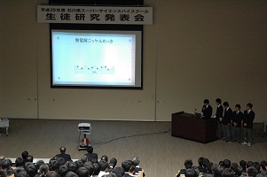 12月14日(木)に石川県地場産業振興センターで上記の発表会が開催されました。本校からは「ミドリムシの増殖に影響する要因及び光合成の特徴の探究」 班の(海野さん、中山さん、川上君、砂山君、若林君)と「パラジウムの代替となる銀を用いた無電解ニッケルめっき」班の(重松君、中村君、架谷君、升田君、山内君)が代表で口頭発表を行いました。その他の研究班も、A0サイズの日本語ポスター発表を行い、それぞれがこれまで研究してきた課題研究の成果を披露しました。
