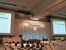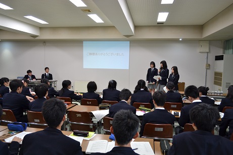 11月3日(木・祝)に、本校の大会議室で上記の発表会を開催し、9つの研究班がそれぞれ研究の成果をパワーポイントで発表しました。生徒と教員の審査の結果、「高等学校の実験環境における大腸菌を用いたHSP(ヒートショックプロテイン)の検出」(3班:加藤さん、伊藤さん寺下さん、由井さん)、「酸化亜鉛による色素増感太陽電池の半導体の代替」(4班:德田さん、三宅さん、西尾さん、渡會さん、角野さん、長舩さん)が本校の代表に選ばれ、石川県スーパーサイエンスハイスクール生徒研究発表会で発表を行いました。