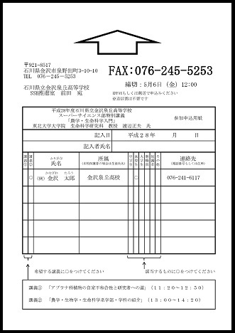 今回の講義は、県内中学・高校の生徒さん及び教員の方、保護者の方も参加対象といたします。参加希望の方は下記の申し込み用紙に必要事項を記入の上、以下の連絡先へFAXまたは郵送でご提出ください。