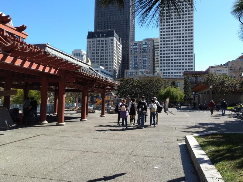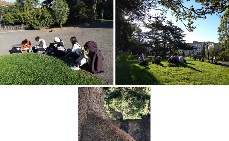 今日は丸1日、カリフォルニア大学バークレー校(UCB)での活動です。駅での集合時間より早く全員が集まり、余裕ができたので、キャンパスツアーの前に今日の午後の発表に向けて最終確認をする時間を取りました。文章を練り直したり、発音を確認したりと、芝生の上で各々の課題に取り組む姿は大学生のようです。近くをリスが通っても気にしません。そういえばスタンフォード大学でもリスを見ました。アメリカの大学あるあるなのでしょうか。
