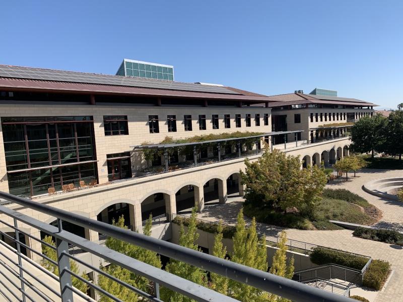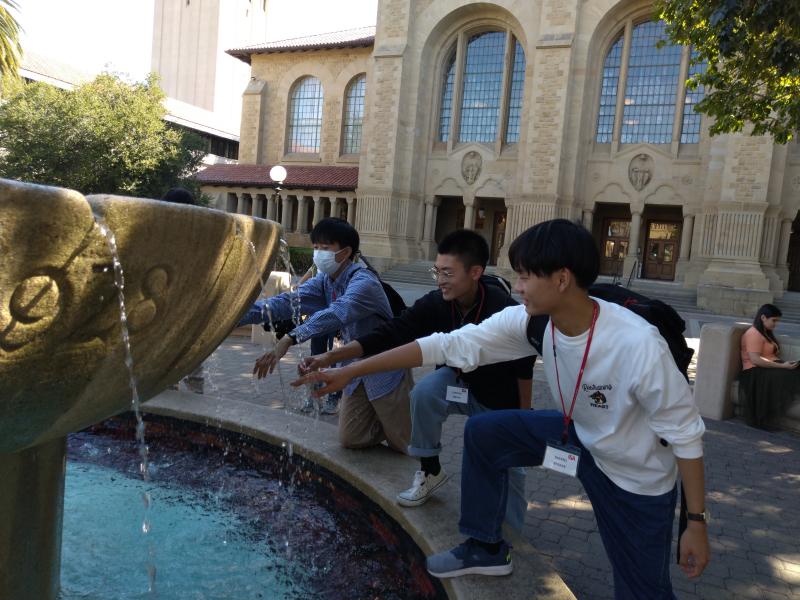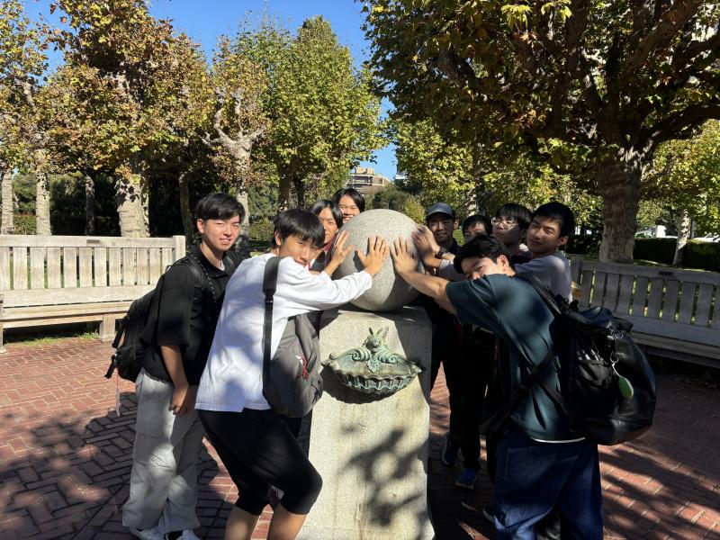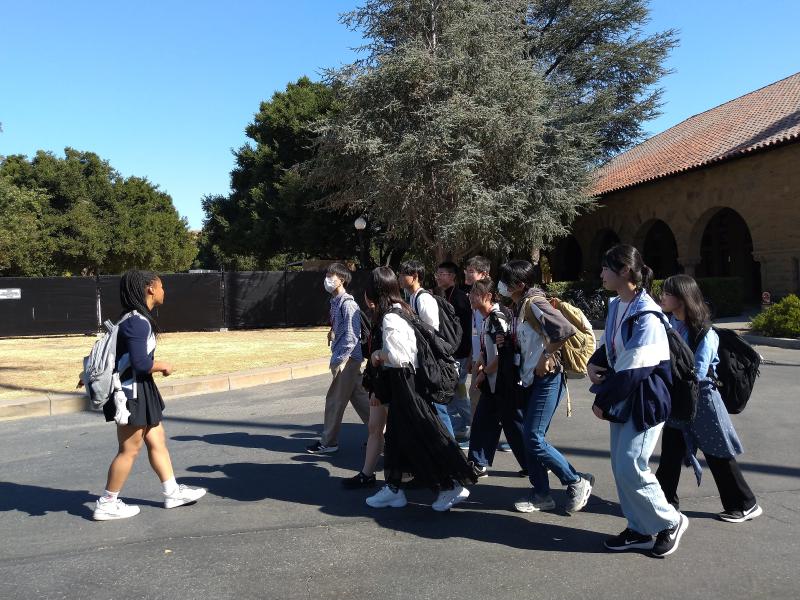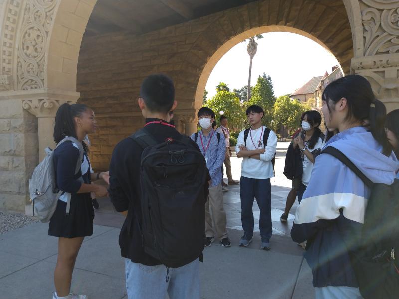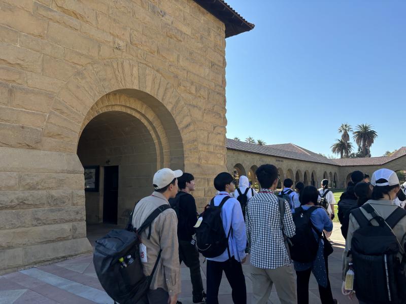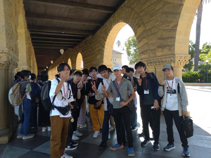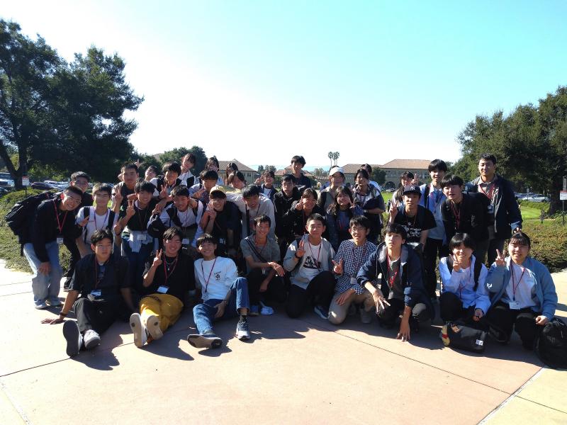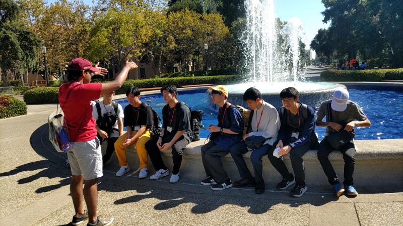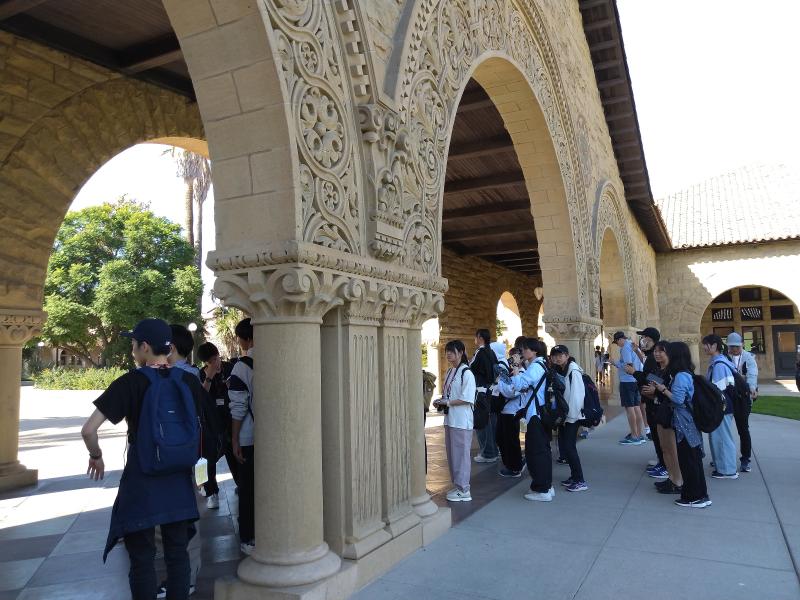 米国研修4日目です。今日はホストファミリーに送迎してもらい、ラファイエット駅に集合しました。そこからバスで1.5時間移動し、スタンフォード大学に到着。最初にメモリアルコートの前で集合写真を撮りました。