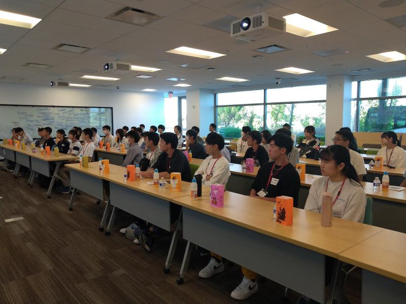 気温35℃の強烈な日差しを浴びつつメモリアルコートを通過し、その後は4つのグループに分かれて大学内を見学しました。