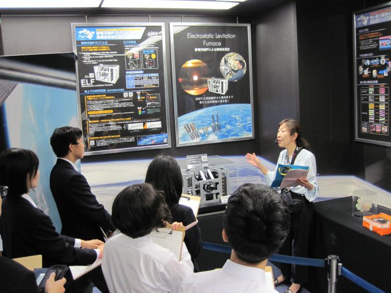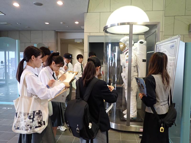 宇宙センターの概要説明を聞いた後、2グループに分かれて宇宙飛行士養成エリアの見学と「きぼう」運用管制室の見学を行いました。宇宙飛行士養成エリアでは、宇宙飛行士が船外活動をする際に着用する宇宙服の説明や、宇宙で行っている実験の説明を聞きました。無重力ならではのメリット・デメリットがよくわかりました。「きぼう」運用管制室では、それぞれの区画がどのような業務を行っているのか詳しく聞くことができました。モニターでNASAの管制室の様子やISLから見たリアルタイムの地球の様子を見ることもでき、大変貴重な体験をすることができました。