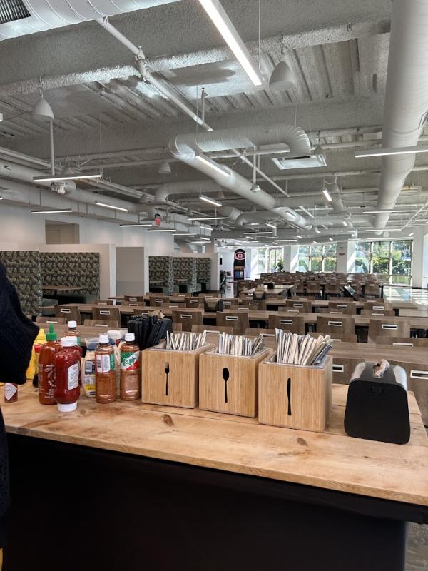 I went to Rakuten company. The place is where workers eat lunch together. It was made for good relationships between the workers.