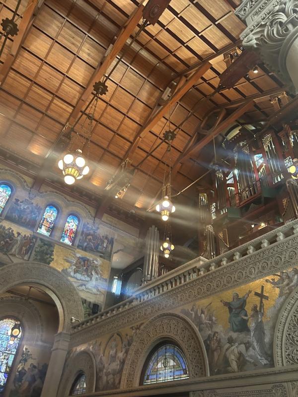メモリアルチャーチは外から見ても歴史を感じる建物でしたが、中はステンドグラスが息をのむほど美しく、荘厳な雰囲気がありました。思わず声を潜めますが、せっかくなので写真を1枚。