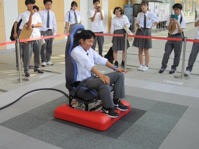 防災研ではまず、全員が地震ザブトンの体験をしました。東日本大震災などの過去の大地震や想定東海地震など、体験する地震を選ぶことができ、揺れの大きさや特徴を体験することができました。今回、大型降雨実験施設の見学はできませんでしたが、効率的に実験を行うため施設自体が移動することや、広大な実験施設の4分の1面ずつ雨を降らせることができるなど、巨大な施設を効率的に使用し多くの実験を行っていることがわかりました。