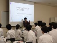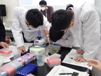 テーマは「リアルタイムPCR法によるウイルスの検出」。PCRや電気泳動についての講義を受け、DNAウイルスの希釈液を作成し、リアルタイムPCRで目的のDNA断片を増幅する実験を行いました。また、通常のPCR法で増やしたDNA断片を電気泳動する実験も同時並行で行いました。事前にマクロピペットの使い方を復習していたので、スムーズに実験を進めることができました。