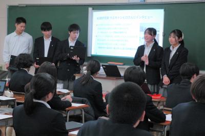 12月12日(火)6・7限に、課題探究Ⅰのキーワードグループ内発表会を発表会を開催しました。生徒達は、キーワード毎に分かれた教室で、グループ毎にこれまでの研究の成果を口頭発表しました。文理融合のチームは今年初めての試みでしたが、それぞれの良いところがブレンドされ、とてもバランスの良い発表となっていました。質疑応答も活発に行われました。
