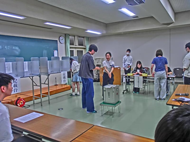摸擬選挙では、金沢市・石川県選挙管理委員会の方から選挙のイロハを学んだあと、本番さながらの投票が行われました。住民票のあるところで投票権があること、疑義のある投票の扱いなどいろいろ話題があり参考になったと思います。自分の思いを一票に託すことの重要性を学ぶことができました。