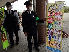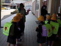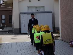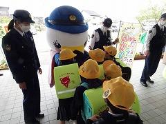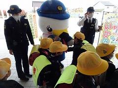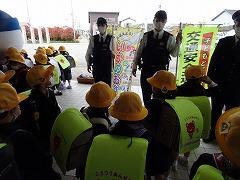 ↑子供たちは大喜び、津幡警察署のおまわりさんは、「安全に気を付けて登下校してください」、「『「いかのおしし」を守ってください』と呼びかけてくださいました。