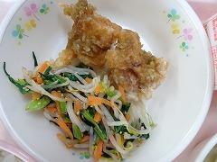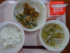 ↑今日の給食は、韓国料理で、ユーリンチー、小松菜のナムル、水餃子でした。鶏肉には、ねぎ、しょうが、にんにくで香りづけされ、とてもおいしかったです。今年も給食が楽しみです。ごちそうさまでした。