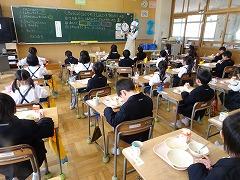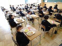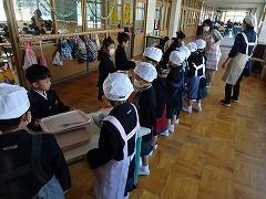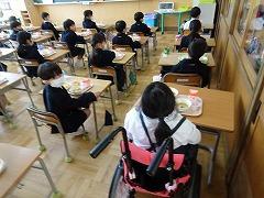 ↑今日から1年生は給食スタートです。みんなで協力して給食に準備や後片付けをしました。