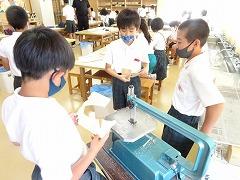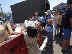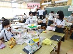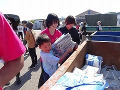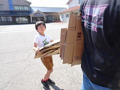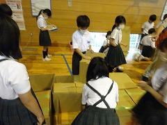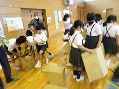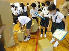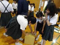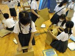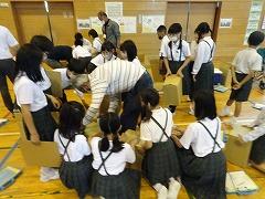 ↓その次に、段ボールベッド作りを体験させていただきました。みんなで手分けして作りました。強度を出すために、段ボールの中に斜めに段ボールの板を入れていきました。