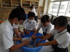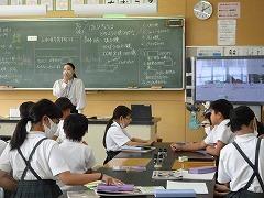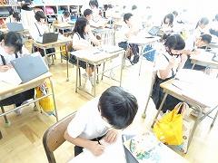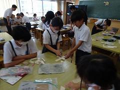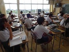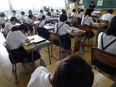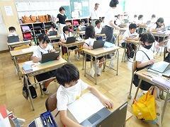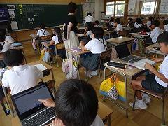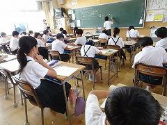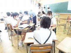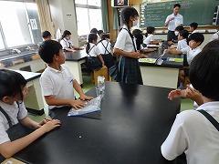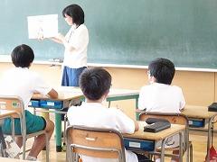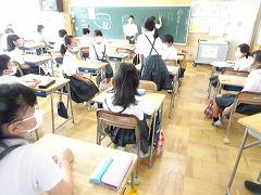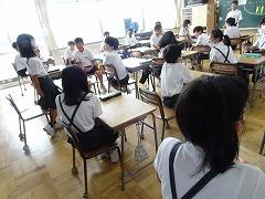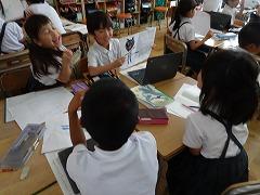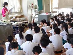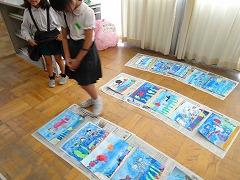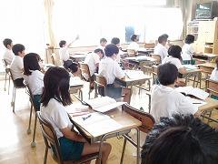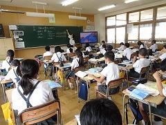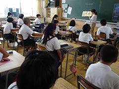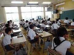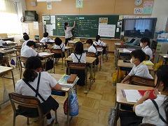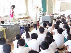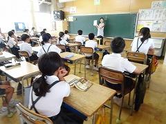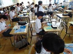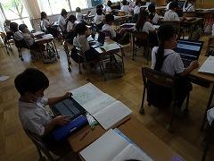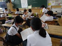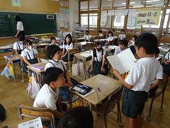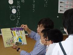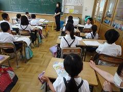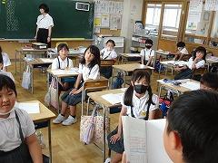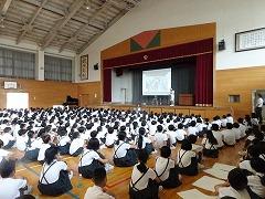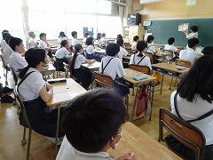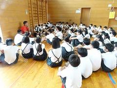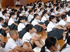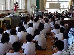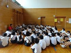 ↓夏休み読書感想文の課題図書について、学校司書、司書教諭による学年ごとのブックトークをしています。本の内容が少しわかると、課題図書に興味を持って読んでみたいという気持ちが高まります。この夏休み、読書に親しんでほしいと思います。