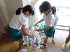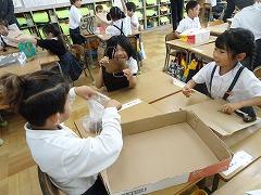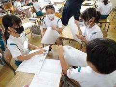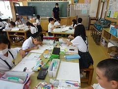 ↓2年図画工作 透明色紙を重ねてできる形や色などの造形的な面白さや楽しさについて、感じ取ったり考えたりしながら自分の感じ方や見方を広げる学習です。