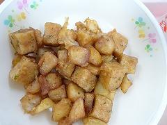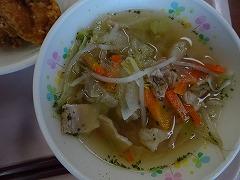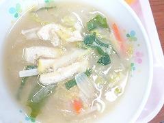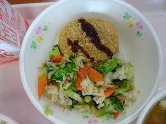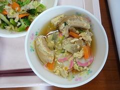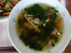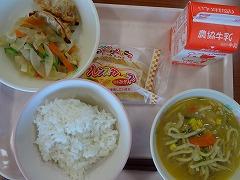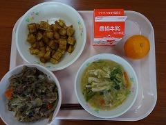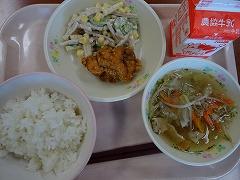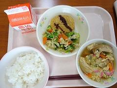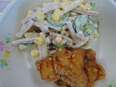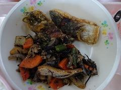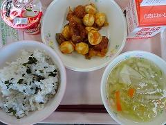 ↓今日の給食は、さばの竜田揚げ、塩昆布和え、さわにわんでした。