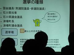 ↓6年生 選挙についての学習会。社会科で政治の学習をしましたが、みんなの代表を選挙で選ぶこのができる選挙権は18歳に引き下げられています。6年生は津幡町の総務課の方と選挙について楽しく学ぶ機会をいただきました。