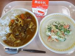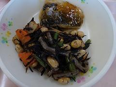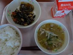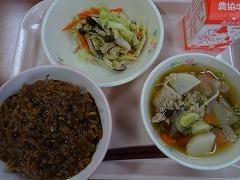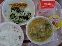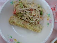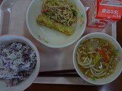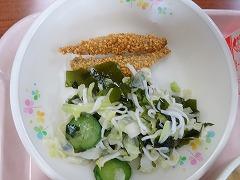 ↓今日の給食です。きびなごのカリカリフライ、酢の物、とり野菜、2色ゼリーでした。