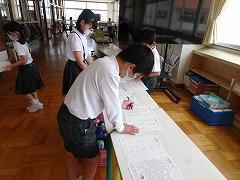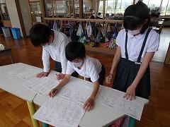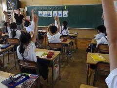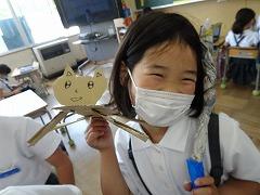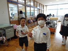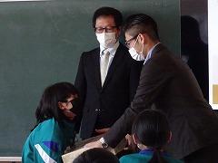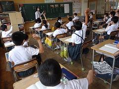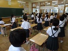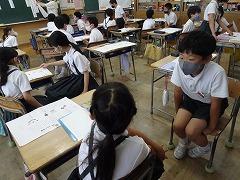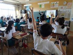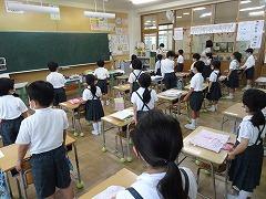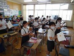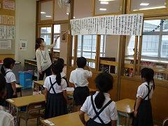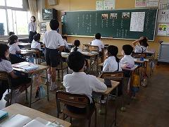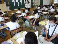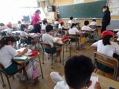 ↑図書委員会のお知らせを伝えに、高学年のお兄さんが1年生のクラスにやってきました。楽しい企画をしてくれたことに感謝の気持ちを込めて、立って、「ありがとうございます」と感謝の気持ちを伝えていました。このように感謝してもらえると、企画したかいがありますね。すてきな心が伝わりました。