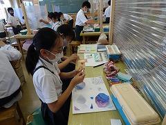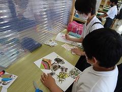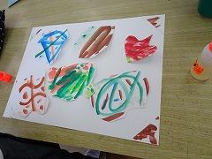 ↑5の3 図画工作 「心のもよう」デザインした模様を形や色、配置を工夫して貼り付けていきました。