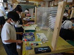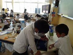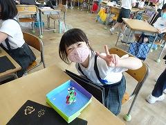↑2年生 おもちゃの作品をクロームブックで写真に撮っています。たくさん工夫をした宝物おもちゃです。