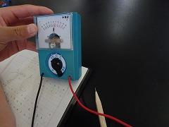 ↑4年理科 モーターが反対に回るのはどうしてか 電気が流れる向きに関係があるのではないか、検流計を使って調べました。
