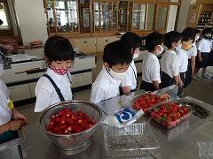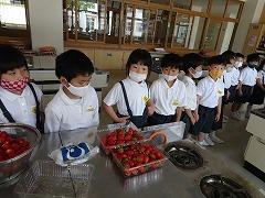 ↑いちごは給食の時に、コンポートにしていただきました。甘い香りが部屋中にただよっていました。ごちそうさまでした。