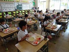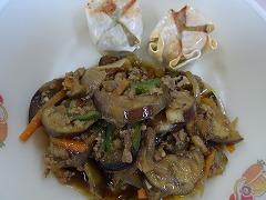↓今日は「マーボなす」です。なすには調理師さんの工夫があります。「なすは子供たちは苦手なため、皮を網目の向き方にして、おしゃれに仕立てました。」と。子供たちのために、一手間も二手間もかけて、愛情たっぷり、おいしさ満点の給食です。ニンニクもたっぷり入って、「格段においしいマーボなす」でした!えだまめシュウマイは彩りも味も抜群、春雨スープは涼しげで、しかも、鶏肉のこくがあり、とてもおいしい中華料理でした。
