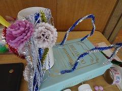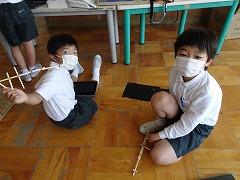 ↓折り紙で作った「スマホスタンド」だそうです。ダイヤモンドにも早変わりします。折り紙って楽しいですね。こちらは、割りばしとゴムで作ったおもちゃです。手作りですから、いろいろ改良も可能です。楽しいですね。